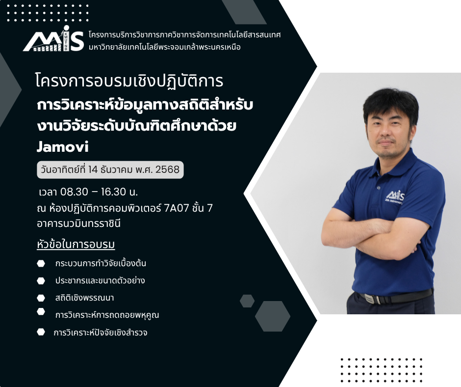 4.1 เพื่อให้นักศึกษาและผู้เข้าอบรมสามารถใช้โปรแกรม Jamovi เพื่อการวิเคราะห์สถิติต่าง ๆ 4.2 เพื่อเสริมสร้างภาพลักษณ์ของหลักสูตรและภาควิชาการจัดการเทคโนโลยีสารสนเทศ 4.3 เพื่อสร้างความสัมพันธ์อันดีระหว่างนักศึกษาและอาจารย์