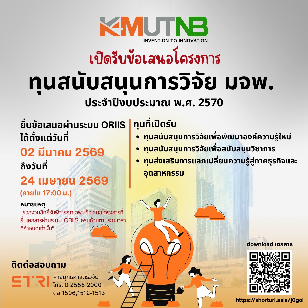 รับสมัครทุนอุดหนุนการวิจัยจากเงินรายได้ของมหาวิทยาลัย (มจพ.) ประจำปีงบประมาณ พ.ศ. 2570
