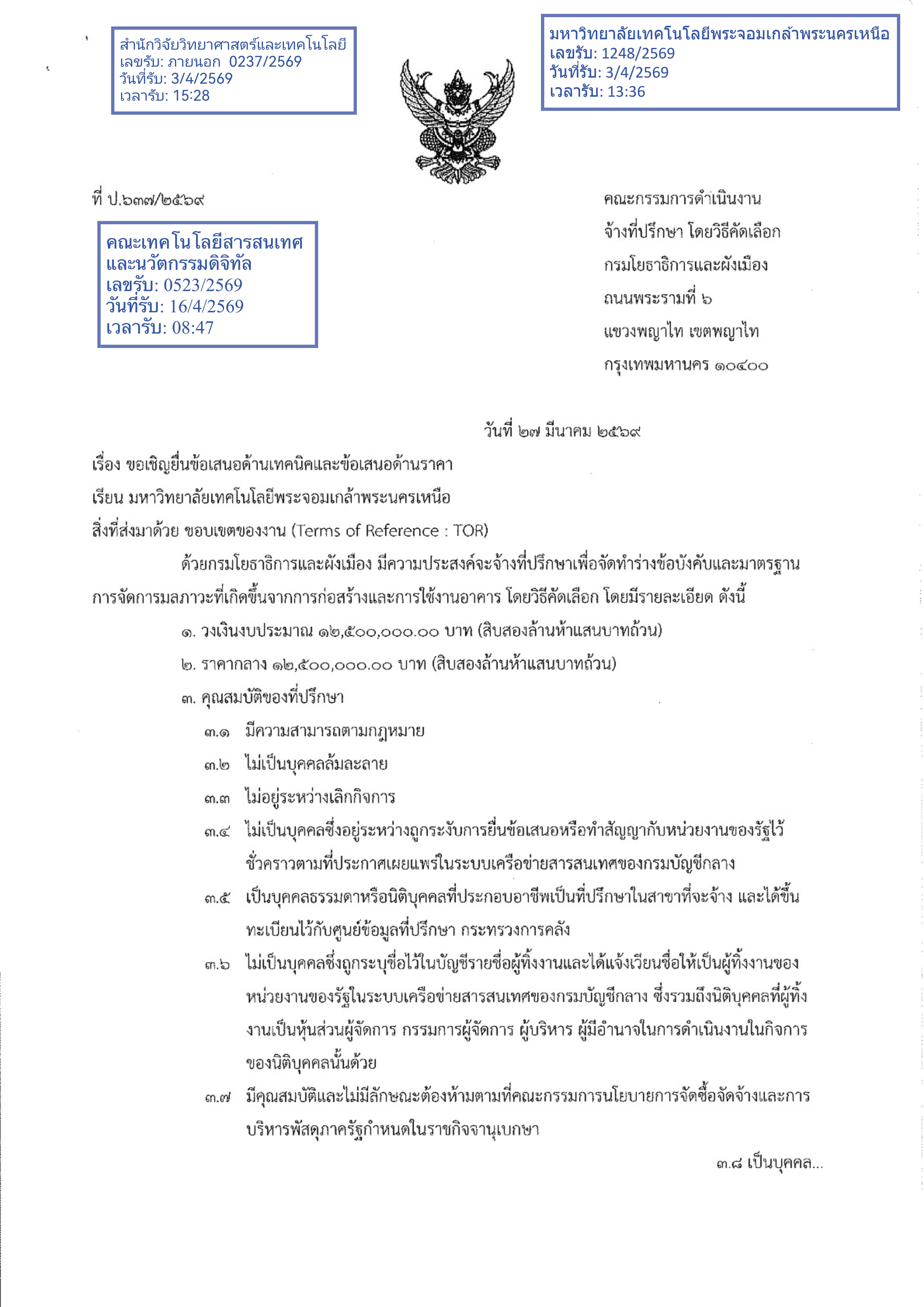 เรื่อง ขอเชิญยื่นข้อเสนอด้านเทคนิคและข้อเสนอด้านราคา