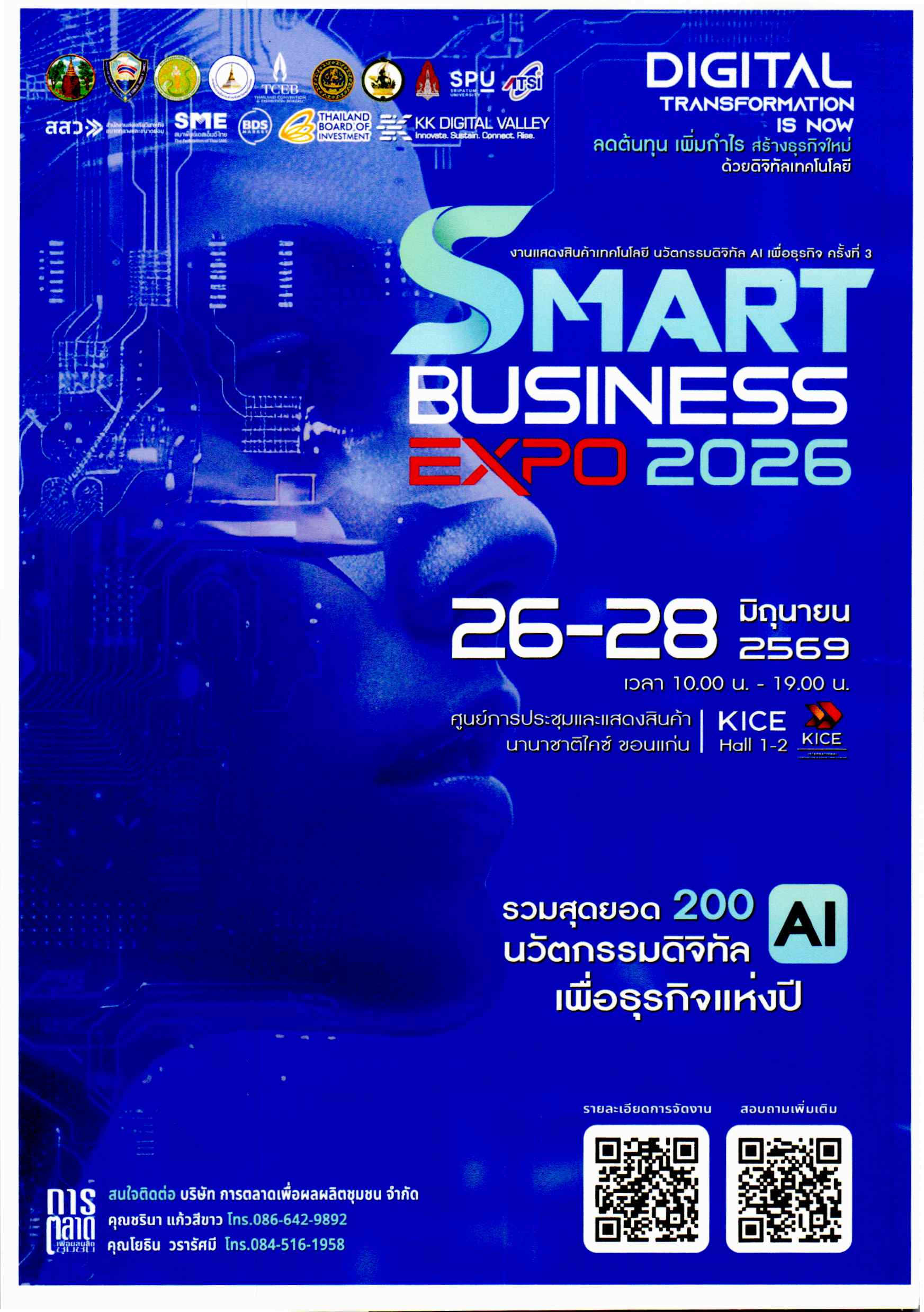 ด้วยหอการค้าจังหวัดขอนแก่น กำหนดจัดงานแสดงสินค้า เทคโนโลยี นวัตกรรมดิจิทัล AI เพื่อธุรกิจ "SMART BUSINESS EXPO 2026"ครั้งที่ 3 ระหว่างวันที่ 26 - 28 มิถุนายน 2569 ณ Hall 1-2 ศูนย์ประชุมและแสดงสินก้านานาชาติไคซ์ ขอนแก่น (KICE) โดยมีวัตถุประสงค์เพื่อส่งเสริมและสนับสนุนให้สมาชิกหอการค้าจาก 20 จังหวัดในภาคตะวันออกเฉียงเหนือ ได้มีโอกาสศึกษา แลกเปลี่ยนความรู้ และนำเทคโนโลยีดิจิทัลไปต่อยอดธุรกิจ เพื่อยกระดับขีดความสามารถในการแข่งขันอย่างยั่งยืน ภายได้แนวคิด "ลดต้นทุน -เพิ่มกำไร สร้างธุรกิจใหม่ ด้วยดิจิทัลเทคโนโลยี AI " โดยภายในงานจะมีผู้เขาร่วมงานกว่า 6,000 คน จากหลากหลายภาคส่วนทั้งในประเทศและต่างประเทศ รวมถึงนักลงทุน ผู้ประกอบการ นักวิชาการ และหน่วยงานภาครัฐ-เอกชน