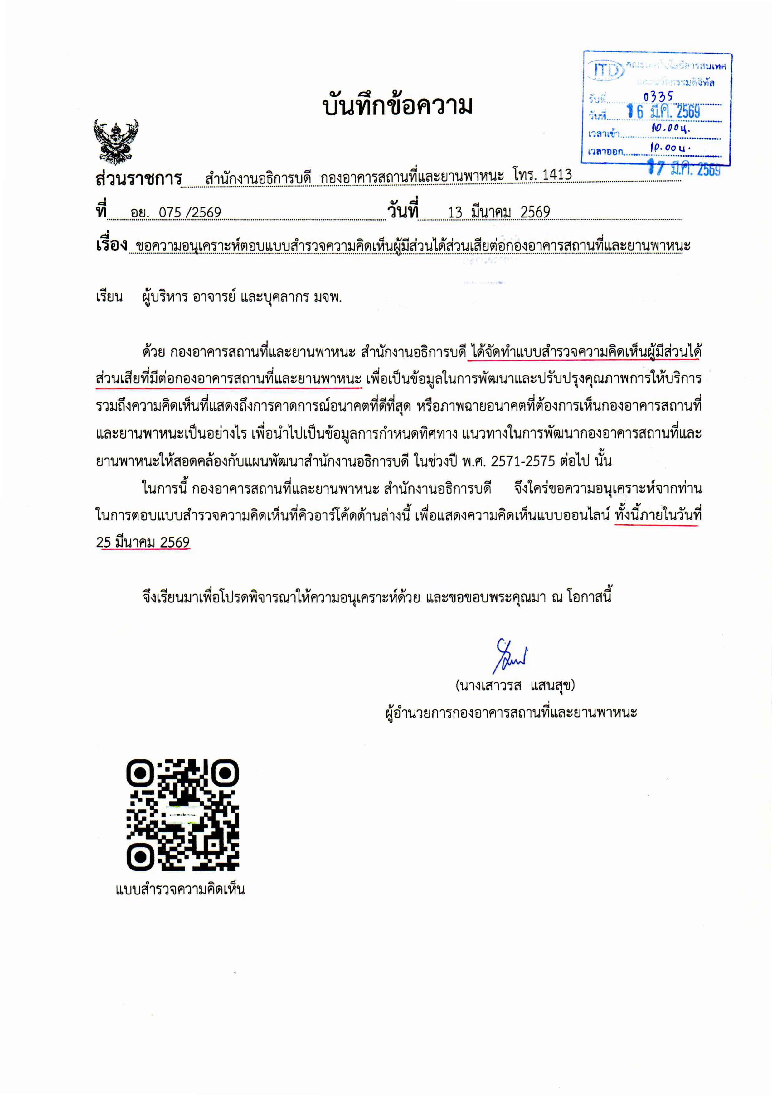 เรื่อง ขอความอนุเคราะห์ตอบแบบสำรวจความคิดเห็นผู้มีส่วนได้ส่วนเสียต่อกองอาคารสถานที่และยานพาหนะ